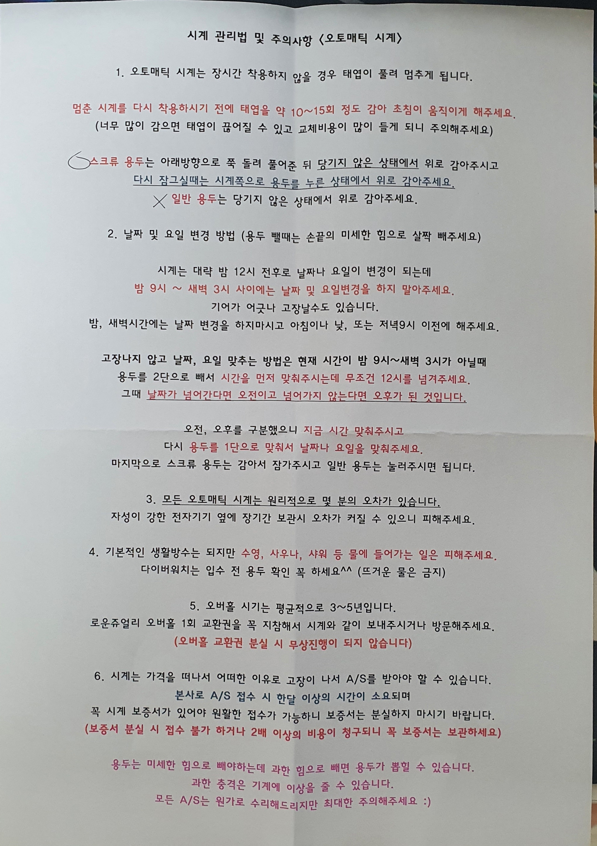 오토메틱 시계에 관한 설명서를 따로 만들어서 주신다.